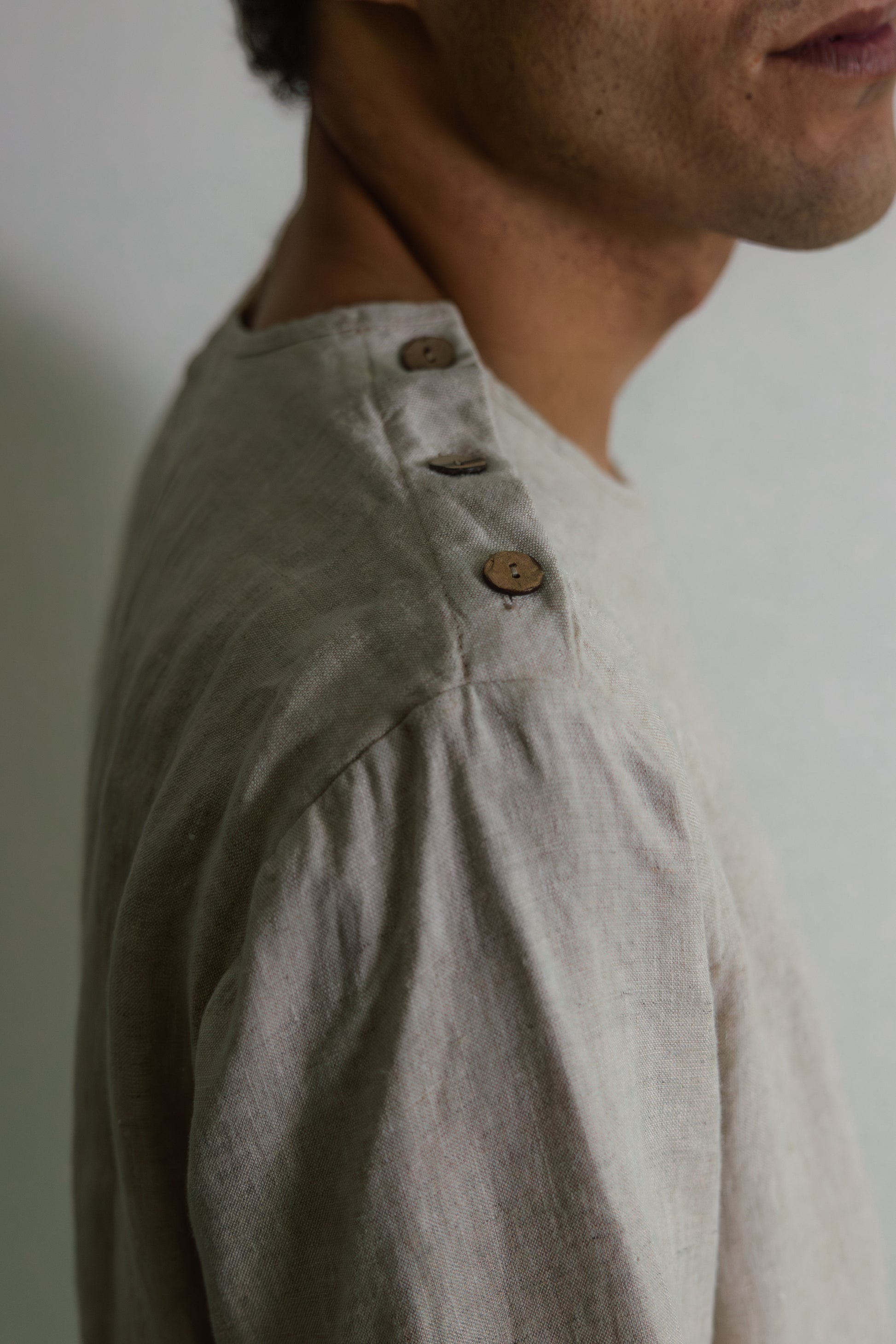 Dit shirt is gemaakt van 100% linnen en voelt licht en ademend aan. Het heeft een ronde halslijn met een knoopsluiting. Gemaakt van natuurlijke kokosknopen, een biologisch afbreekbaar materiaal met een warme, gestructureerde afwerking. Ontworpen met comfort, bewegingsvrijheid en duurzaamheid in gedachten.