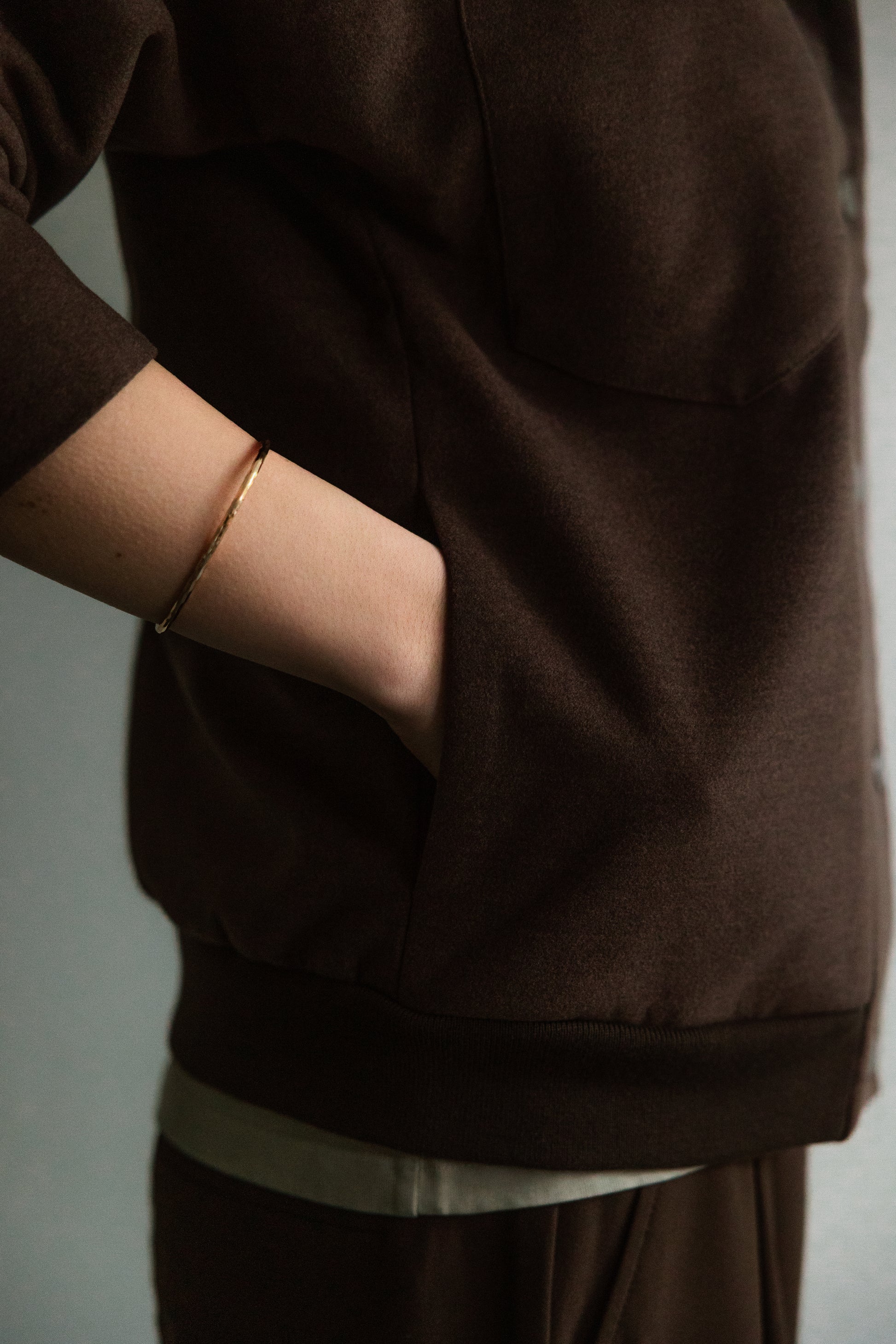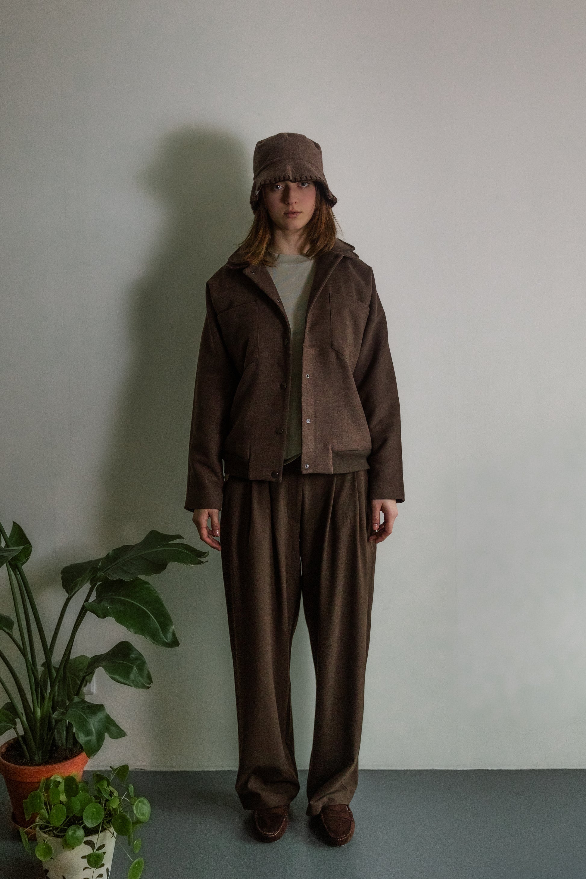 Het jack met dubbele kraag is gemaakt van een zachte stof in een diepbruine tint. Het heeft een dubbele kraag en een strakke sluiting aan de voorkant met drukknopen. Twee borstzakken en subtiele zijzakken voegen zowel functionaliteit als designdetails toe. Het silhouet is geïnspireerd op een klassiek bomberjack, maar dan in een verfijnde en veelzijdige uitvoering. Ontworpen om moeiteloos door alle seizoenen heen gedragen te kunnen worden.