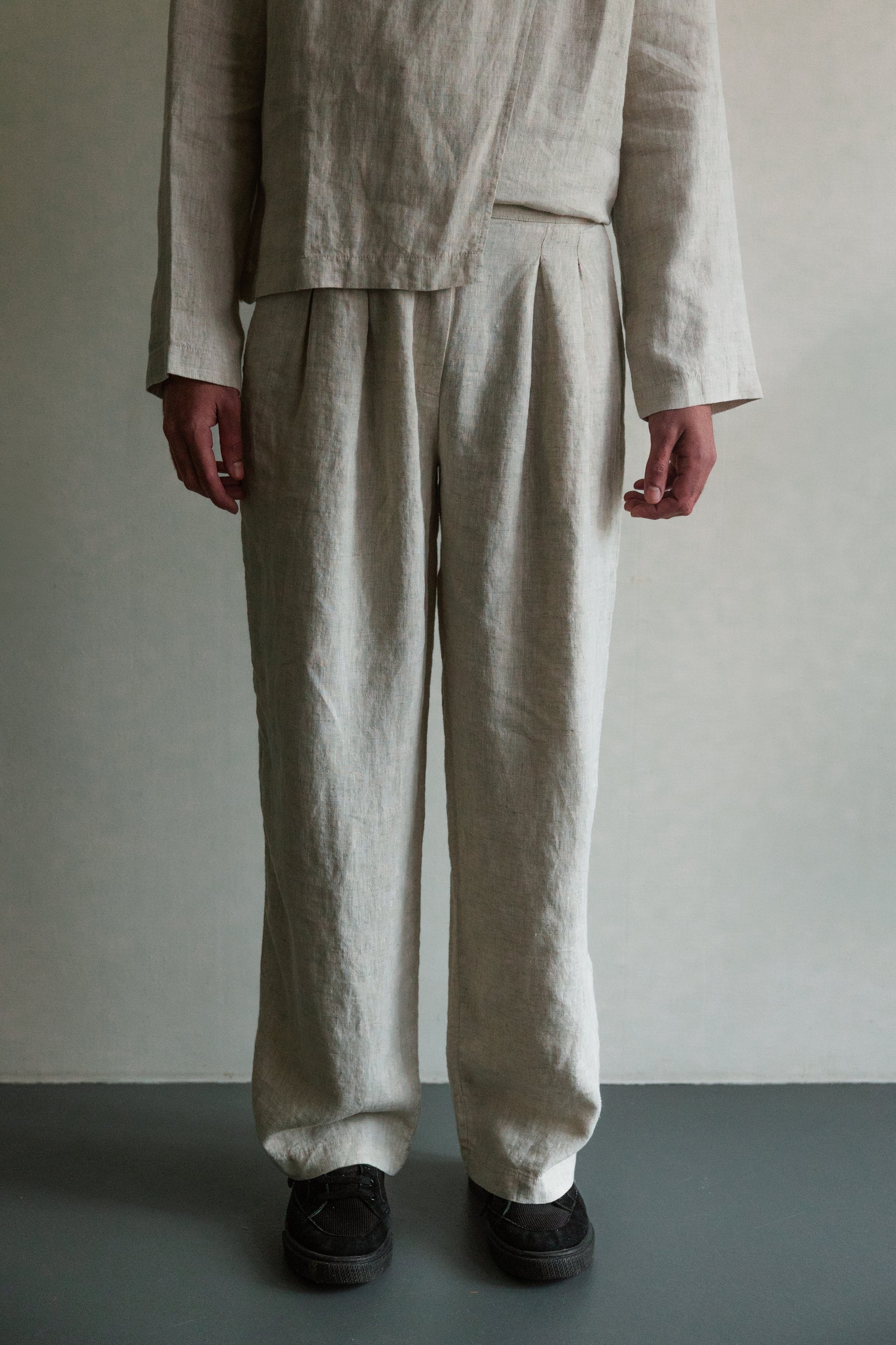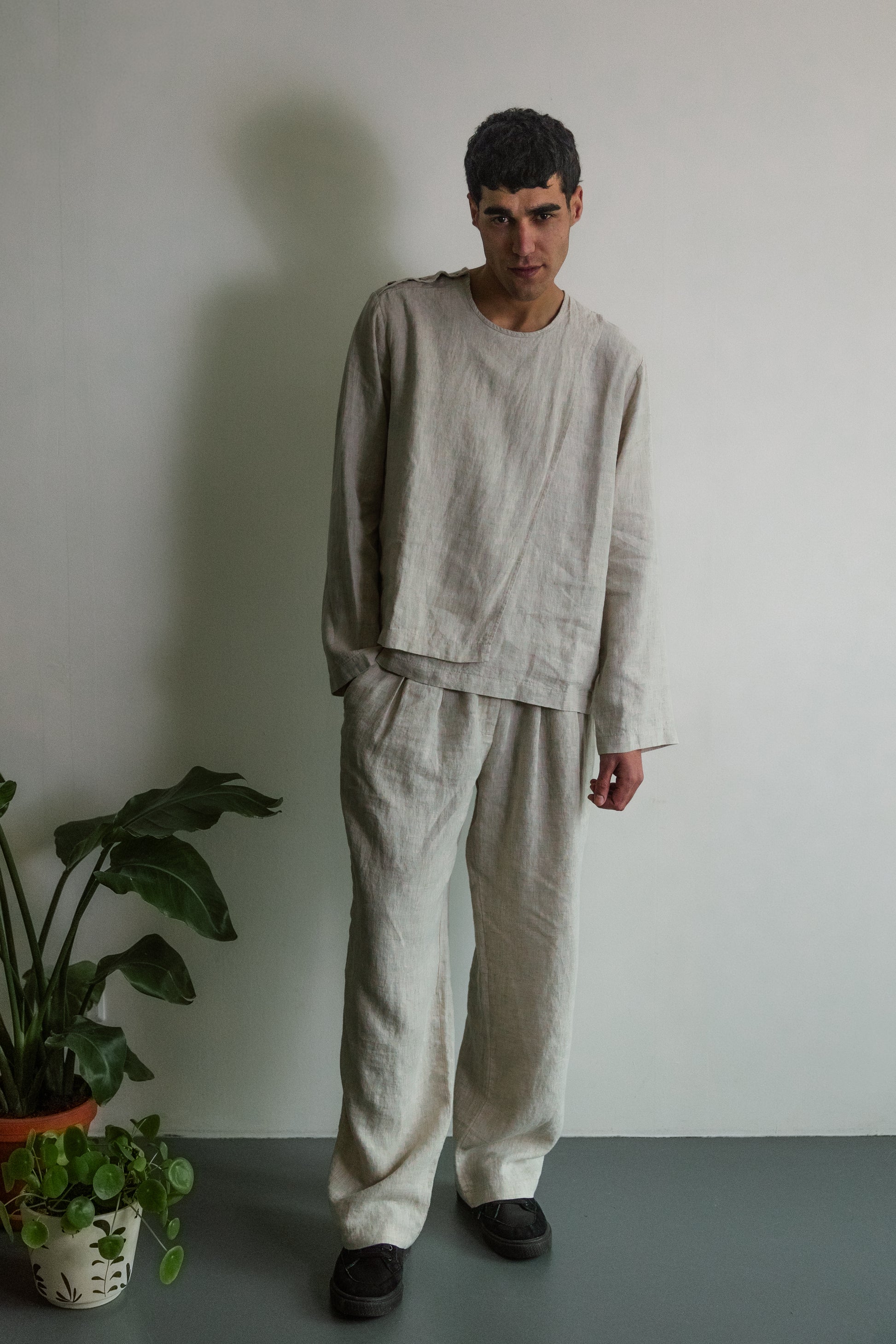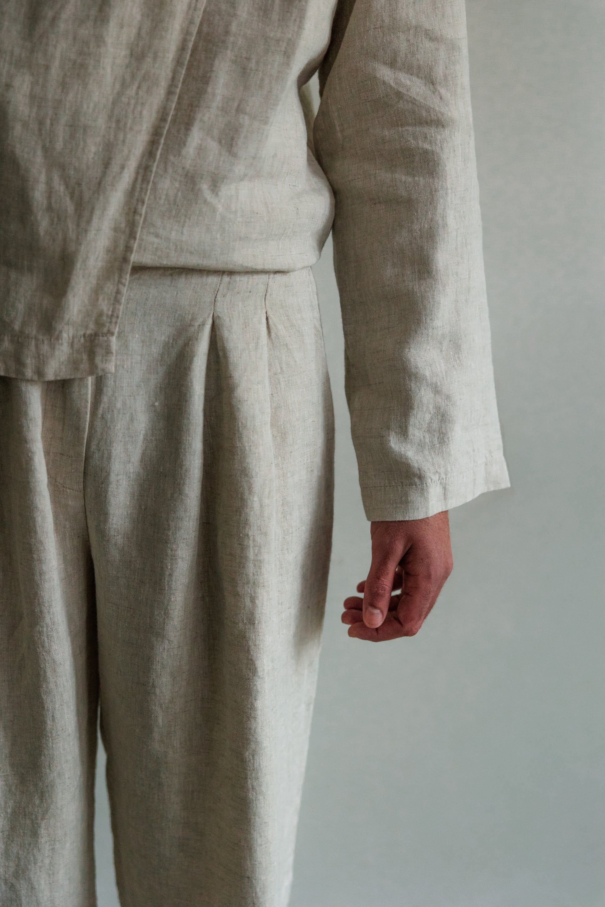 Deze geplooide broek is gemaakt van hetzelfde lichtgewicht 100% linnen als het asymmetrische overhemd, waardoor hij ademend is en veel bewegingsvrijheid biedt. De natuurlijke textuur van de stof zorgt voor een ontspannen, moeiteloos gevoel, terwijl de plooien aan de voorkant structuur en vorm geven. Afgewerkt met een enkele kokosnootknoop. Deze broek kan als set gedragen worden met het asymmetrische linnen overhemd.